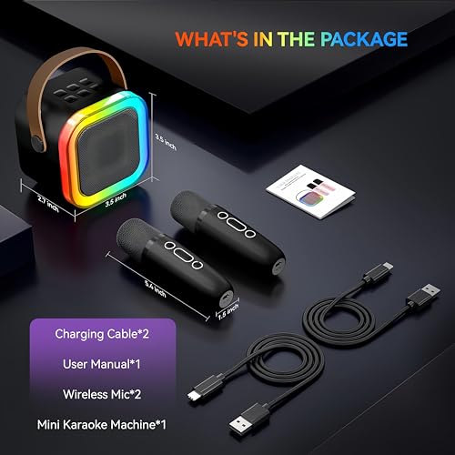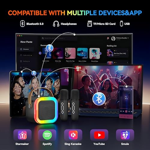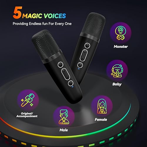 maagoot - الة كاريوكي للاطفال والكبار، ميكروفون كاريوكي صغير محمول يعمل بالبلوتوث مع 2 ميكروفون لاسلكي ومصباح العاب لجميع الهواتف الذكية، اعياد الميلاد، العائلة، الحفلات المنزلية (اسود)
