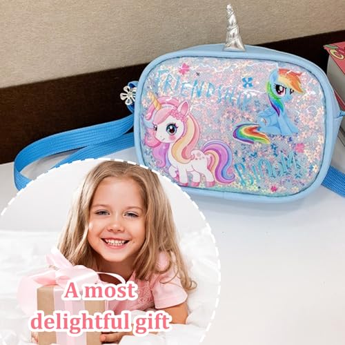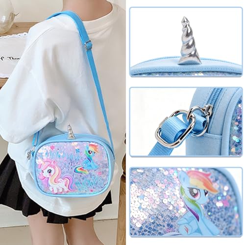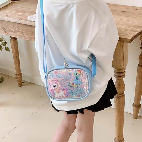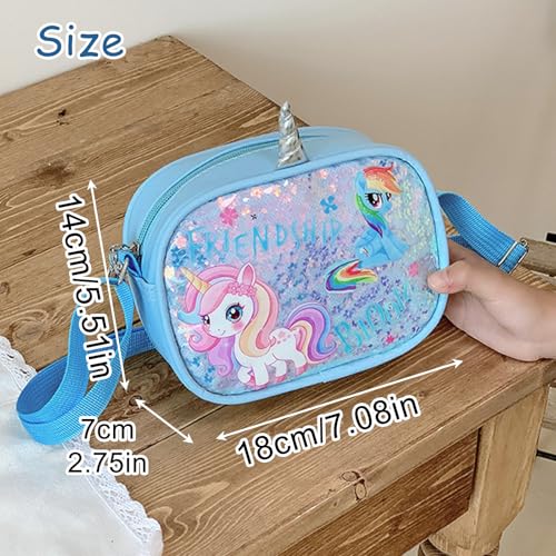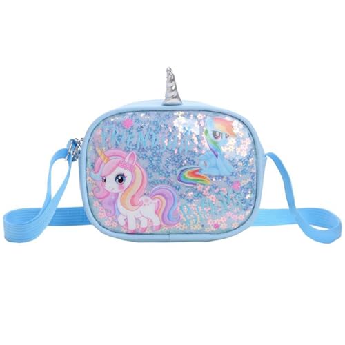 KASESSS - شنطة كتف للبنات الصغيرات بتصميم يونيكورن، شنطة كروس مزينة بالترتر، شنطة يد لطيفة للأطفال مع أشرطة كتف قابلة للتعديل للأطفال البنات والأطفال الصغار والمراهقين من كاسيس، 18×4×14 سم، أزرق