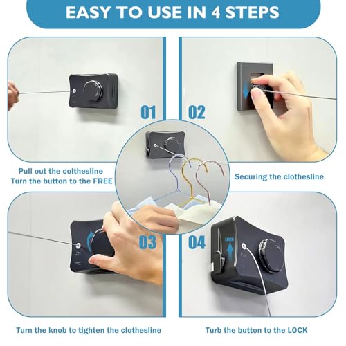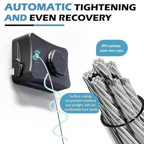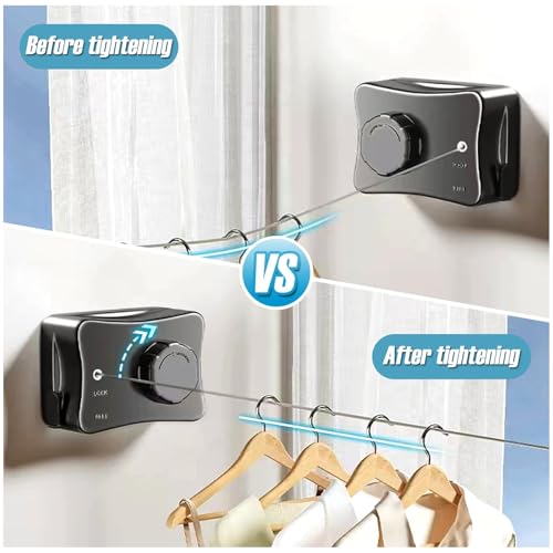 - 🌟 تصميم مانع للتدليل: يتميز حبل الغسيل القابل للسحب بتصميم لا يتدلى ومجهز بآلية قفل وجهاز شد دوار. ببساطة اسحب الطول المطلوب من حبل الغسيل، واضغط على زر القفل، وأدر المقبض لتثبيته، مما يضمن بقائه مشدودًا وخاليًا من الترهل.