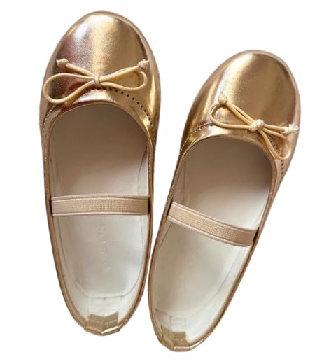 Katee - حذاء مسطح بتصميم فيونكة مع حزام مطاطي من كاتي جيرل - WW2 (لون ذهبي، المقاس: 28)