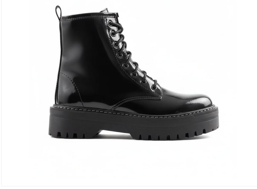 Katee - حذاء قتالي برباط اسود للنساء من كاتي، نعل بنعل مسطح، لمسة نهائية لامعة-BOTFBL (40)