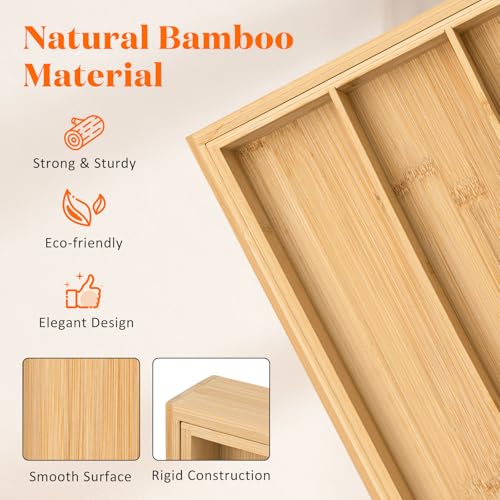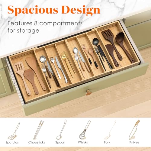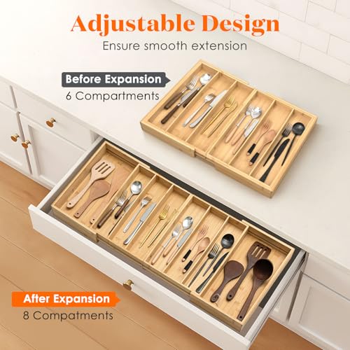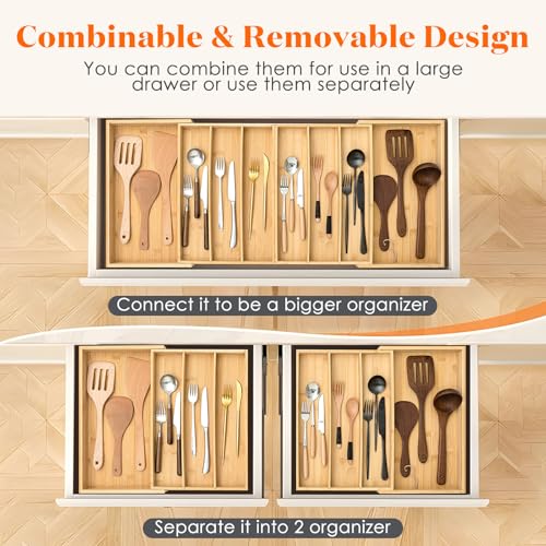 - حل تخزين متعدد الاستخدامات: يتميز بـ 6 مساحات تخزين مركزية إلى جانب اثنين قابلين للتوسيع، يزيد منظم الأواني المصنوع من الخيزران سعة الأدراج العريضة للغاية؛ مصمم لتخزين أدوات المائدة وأدوات المطبخ الكبيرة والأدوات الصغيرة بكفاءة