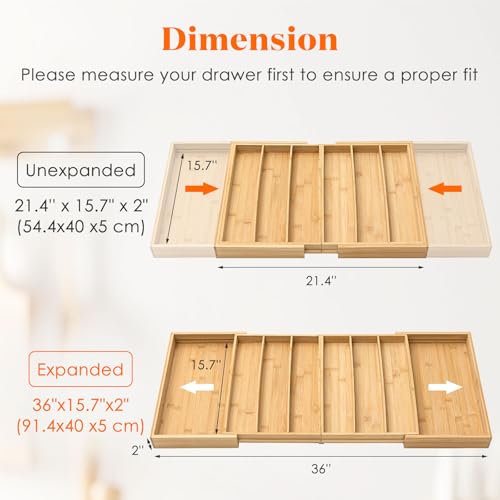 Kathfly - كاث فلاي منظم ادراج كبير جدا لاواني المطبخ قابل للتوسيع بعرض 21.4 الى 36 انش، صينية فضية من الخيزران قابلة للتعديل، منظم ادوات المائدة، حامل مقسم ادراج للملاعق والشوك