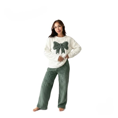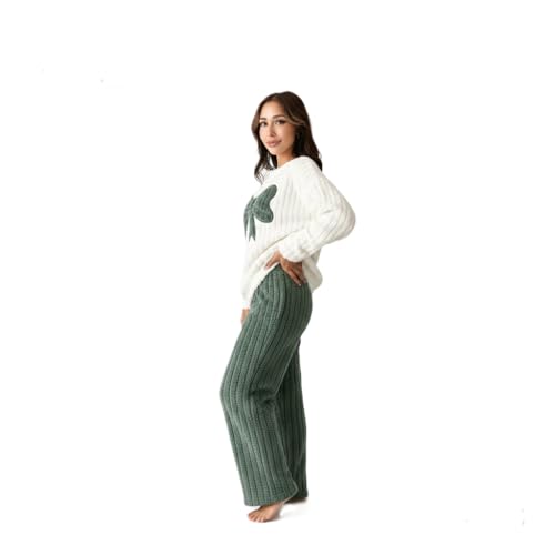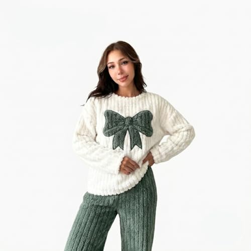 KAYAN STYLE HOWEAR ME - بيجامة فرو مضلعة للنساء من كيان ستايل هوم وير، ابيض واخضر، فيونكة، 55-65k