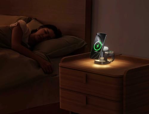 Kcuskl - قاعدة شحن لاسلكية مغناطيسية 4 في 1 لشحن سريع 15W مع ضوء ليلي قابل للتعديل لدعم 3 أجهزة لآيفون 17 و16 و15 و14 و13 برو ماكس وساعة آبل وايربودز من Kcuskl، رمادي (Starlight Gray)