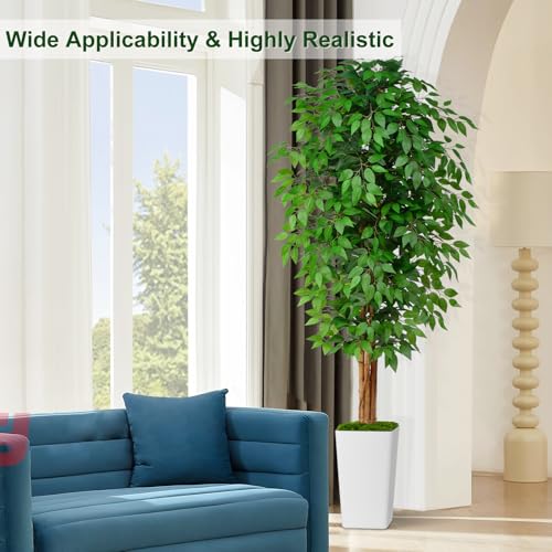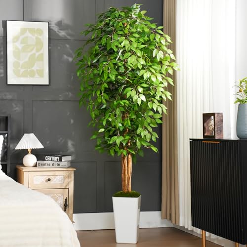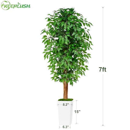 Keeplush - شجرة لبخ صناعية بطول 2 م مع 3 جذوع منحنية طبيعية، شجرة صناعية مورقة بطول 2 م لديكور المنزل الداخلي، شجرة لبخ صناعية خضراء نابضة بالحياة مع أصيص زرع أبيض من كيبلش