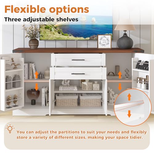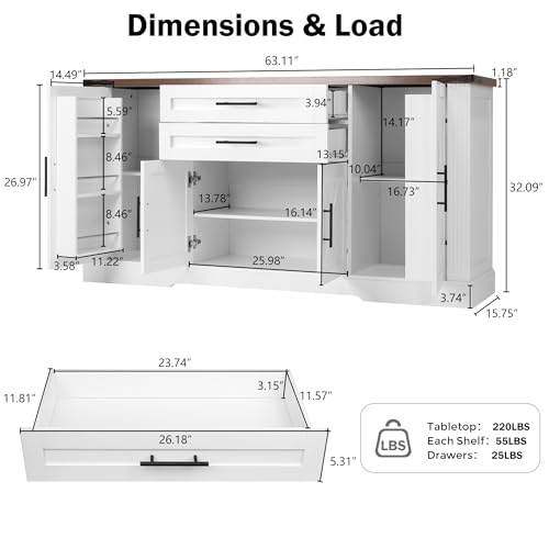 - [سعة تخزين كبيرة] مجهزة بدرجين وأرفف قابلة للتعديل وحوامل أبواب، تتيح وحدة البوفيه الجانبية الكبيرة هذه سهولة تخزين الأطباق والديكور والمستلزمات اليومية.