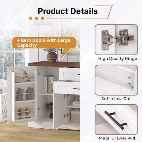 KEIKI - وحدة بوفيه جانبية للتخزين بنمط المزرعة وأبواب حظيرة بطول 1.6 م مع وحدات تخزين مزودة بدرجان، حامل أبواب وأرفف قابلة للتعديل، بوفيه مطبخ، وحدة بوفيه جانبية كبيرة، وحدة للأطباق من كيكي، لون أبيض