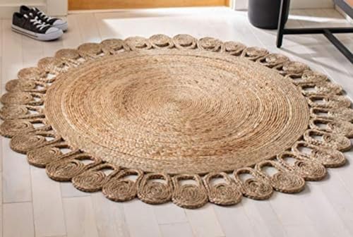Kelmntar - سجادة حالفا دائرية مقاس 1.5 متر، سجادة مصنوعة من نبات الحلف الطبيعي بتصميم مكرمية مريم من كلمنتار