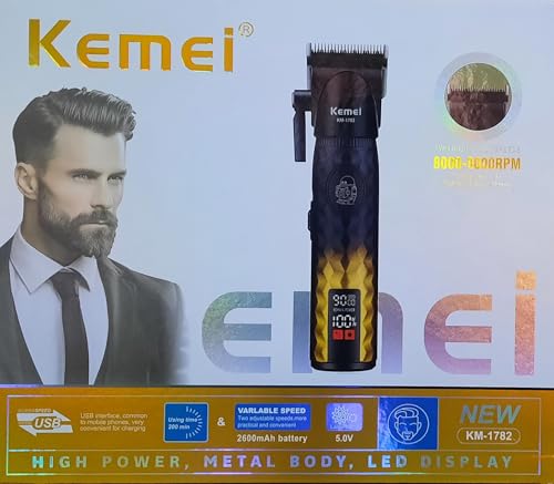 KEMEI - ماكينة حلاقة احترافية KM-1782 بهيكل معدني وشفرات مطلية بالكربون الأسود المطلي بالماس وسرعتان توربو تصلان إلى 9000 دورة في الدقيقة من كيمي