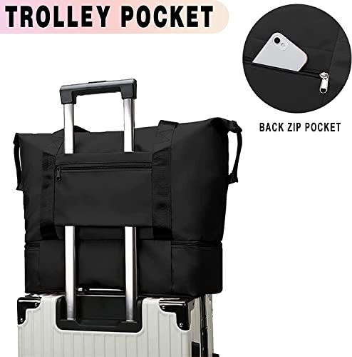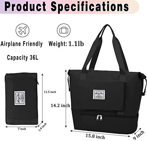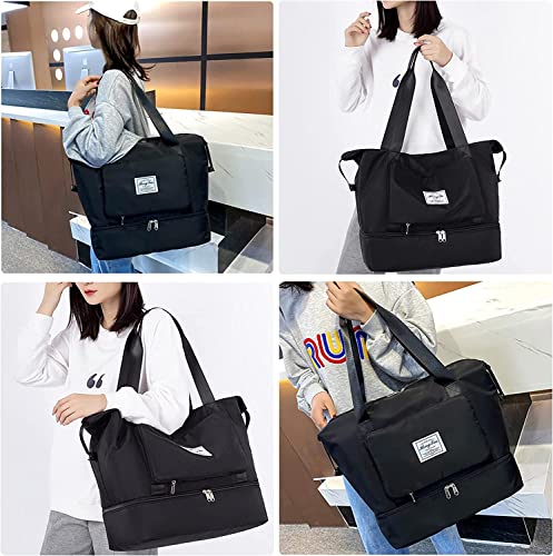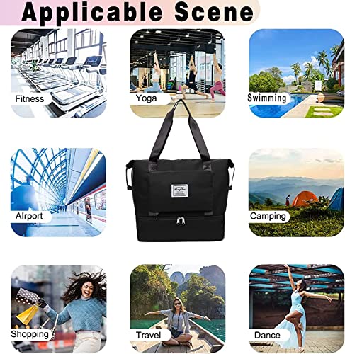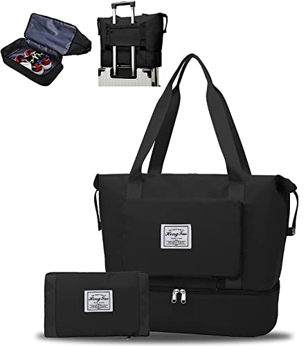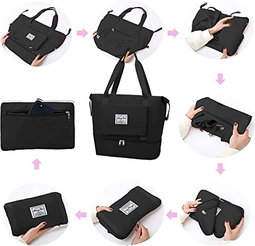 KemyFei - شنطة دفل من القماش الخشن قابلة للطي، شنطة يد للسفر ذات سعة كبيرة، شنط يد كبيرة توت لصالة الالعاب الرياضية ولعطل نهاية الاسبوع، خفيفة الوزن مع فاصل العناصر الجافة عن المبللة, أسود-01