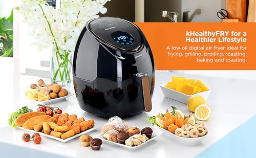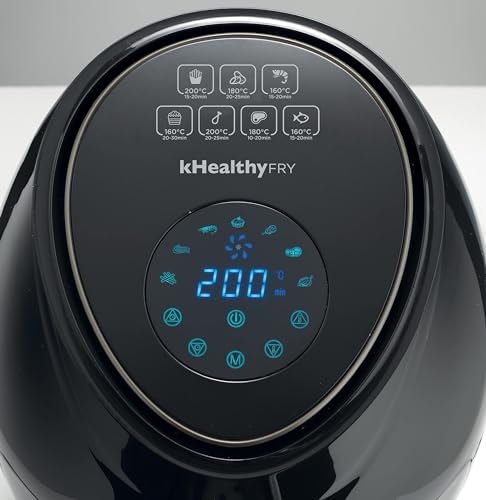 - مقلاة هوائية رقمية مزودة بشاشة تعمل باللمس وخيارات درجة حرارة متعددة قابلة للتعديل والفصل التلقائي لزيادة الأمان، مقاس XXL سعة 5.5 لتر 2.4 كجم من كيه هيلثي فراي من كينوود، طهي صحي طوال اليوم بملعقة زيت واحدة، HFP50.000BK