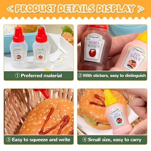 - يتميز المنتج بمجموعة من زجاجات الصلصة الصغيرة، مصممة لتوفير الراحة والعملية في تقديم التوابل. كل زجاجة مثالية لحمل الصلصات المفضلة لديك مثل الكاتشب، مما يجعلها إضافة رائعة لأي إعداد لتناول الطعام.