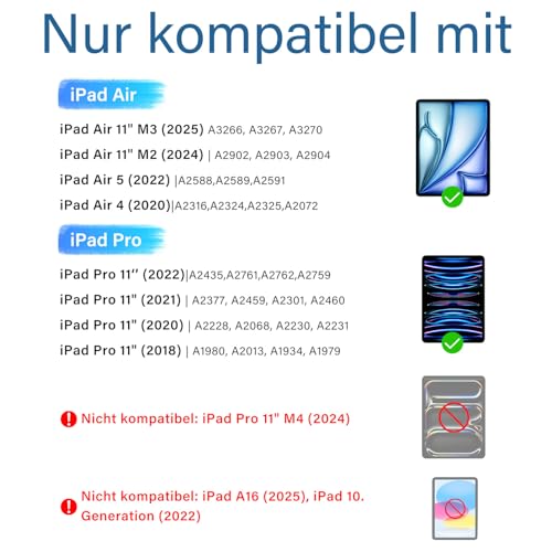 - توافق واسع: مصمم لجهاز ايباد برو 11 بوصة الجيل الرابع 2022 (رقم الموديل: A2423/A761/A2762) وايباد برو 11 بوصة 2021 (رقم الموديل: A2301/A2459/A2460) وايباد برو 11 بوصة 2020 (رقم الموديل: A2068/A2288/A2230/A2222. 31) وايباد برو 11 بوصة 2018 (رقم الموديل: A1980/A1934/A2013) وايباد برو 10.9 بوصة إصدار 2022/2020 (رقم الموديل: A2072/A2316/A2324/A2325/A2588/A2589/A2591 ) يرجى التحقق من رقم الموديل الموجود على الجزء الخلفي من التابلت قبل الشراء.