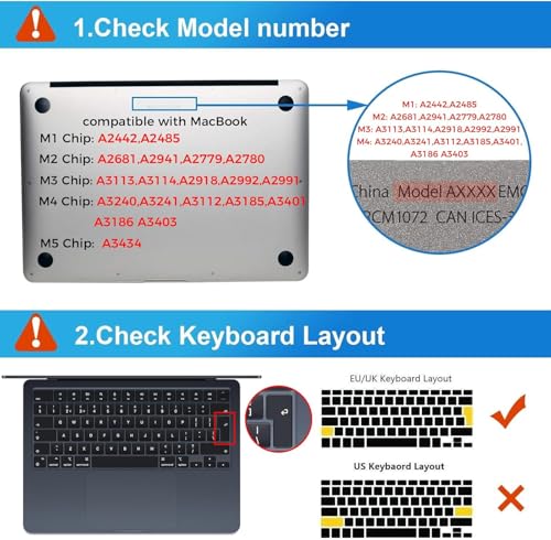 - ✔️ متوافق مع ماك بوك اير الجديد M4 M3 M2 13.6 بوصة (الموديلات: A3240 A3113 A2681، إصدار 2022 2024 2025) ✔️ متوافق مع ماك بوك اير الجديد 15 بوصة M4 M3 M2 مع خاصية التعرف باللمس (الموديلات: A3241 A3114 A2941، إصدار 2023-2025) تصميم تخطيط كويرتي UK وEU. يرجى التحقق من رقم موديل ماك بوك "Axxxx" الموجود أسفل اللاب توب.