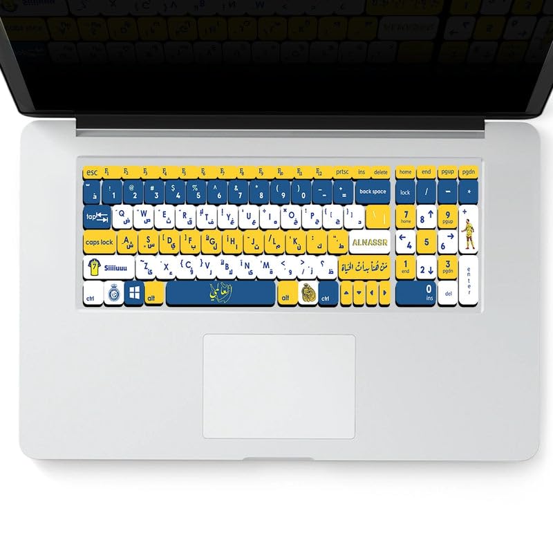 - التصميم: ملصقات كيبورد بطابع ناروتو تتميز بنظام ألوان أحمر وأسود مع شخصيات عربية وإنجليزية لتجربة كتابة ثنائية اللغة