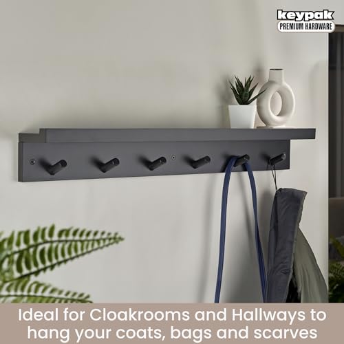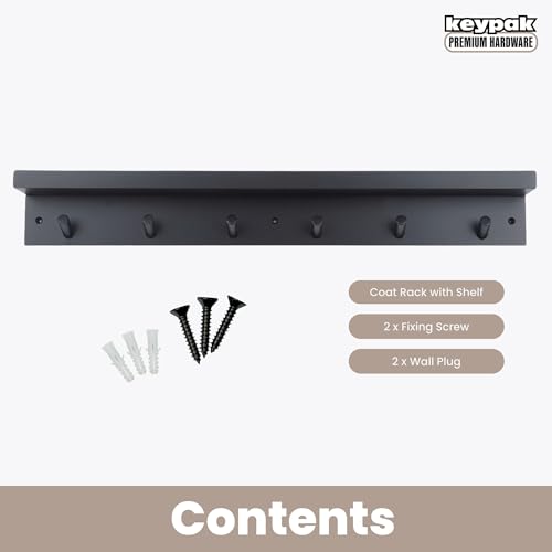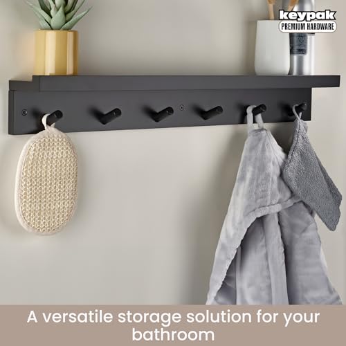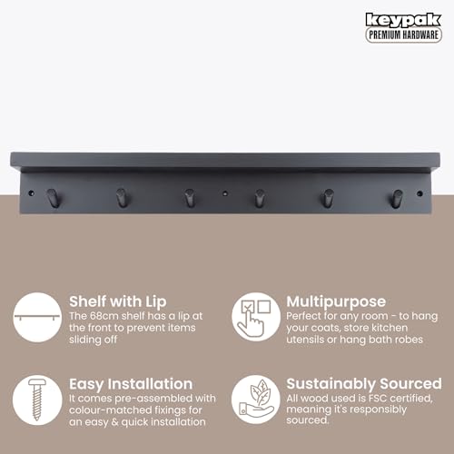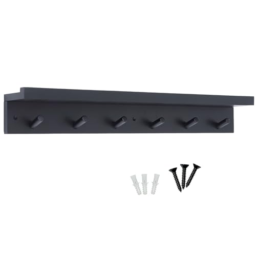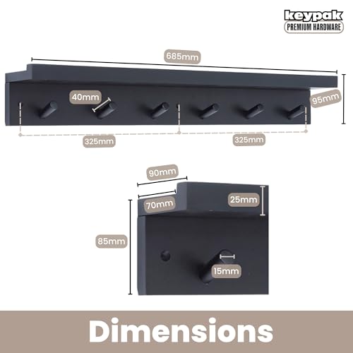 Keypak - 6 خطافات معاطف مع رف خشبي عائم 68 سم شفاه منظم للمعاطف يثبت على الحائط - مجمع مسبقًا يتضمن المثبتات اسود