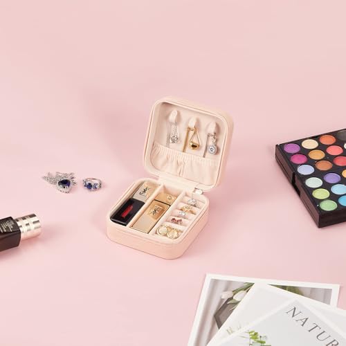Khazna - صندوق مجوهرات صغير من الجلد الصناعي، علبة مجوهرات محمولة للسفر للخواتم والقلادة والحلقان والقلائد والأساور (لون وردي) من خازنا