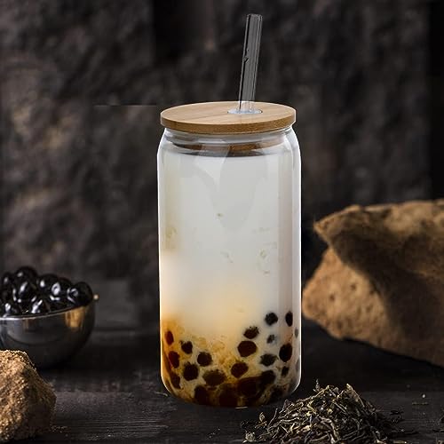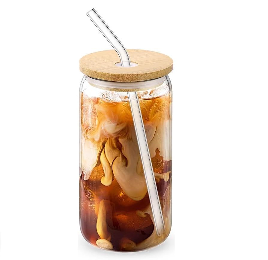 KHOLAD - كوب زجاج على شكل علبة معدن مع غطاء بامبو وشفاطة زجاج، كوب قهوة مثلجة سعة 500 مل بتصميم جميل مناسب لتناول جميع المشروبات الباردة في أي مناسبة من خولاد، (علبة معدن بغطاء خشب - 1)