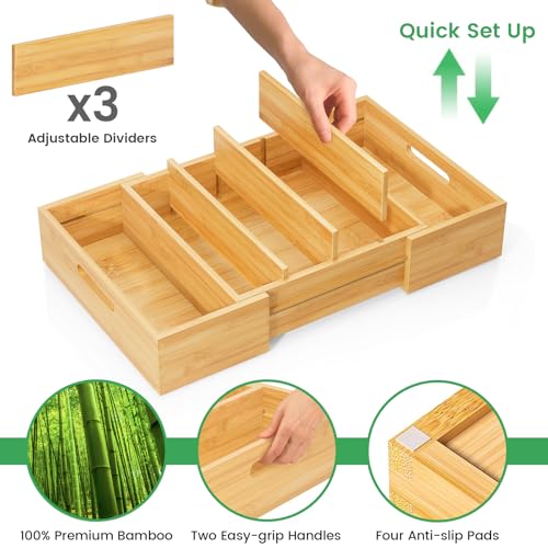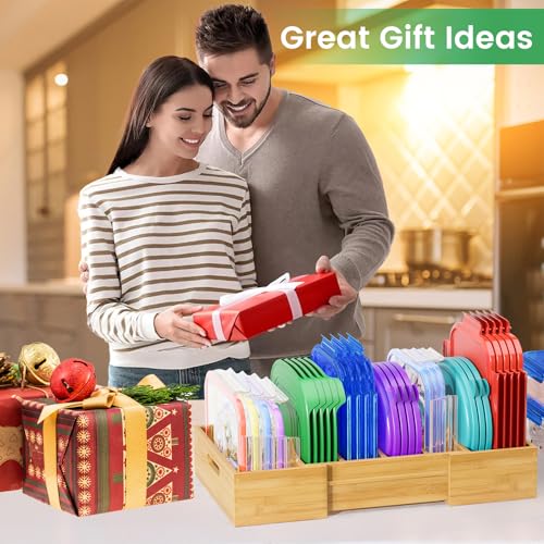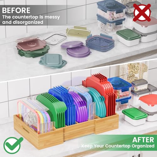 Kiasthome - منظمات اغطية من الخيزران قابلة للتوسيع داخل الخزانة من كياستهوم، منظمات خزانة المطبخ مع 3 فواصل قابلة للتعديل، اغطية بلاستيكية للتخزين، منظم غطاء حاوية الطعام لدرج المؤن، طبيعة