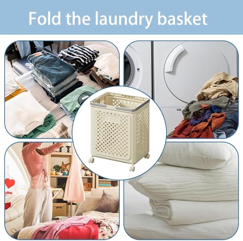 KICKZU - سلة غسيل للملابس مع غطاء من كيكزو، سلة غسيل للتخزين مع عجلات، سلة تخزين بلاستيكية محمولة قابلة للطي ومتينة وعملية للغسيل والحمام، ابيض