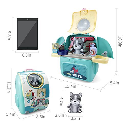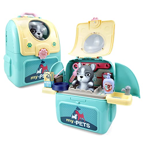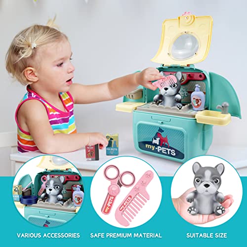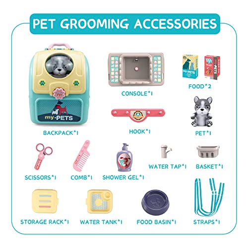 - 【مجموعة العناية بالحيوانات الأليفة للعب التظاهري للأطفال】مجموعة ألعاب تظاهرية للعناية بالحيوانات الأليفة مكونة من 16 قطعة مع حقيبة ظهر للجراء ومقص ومشط وسلة استحمام وجل ووعاء طعام للحيوانات الأليفة ولوح لعب وشريط لاصق