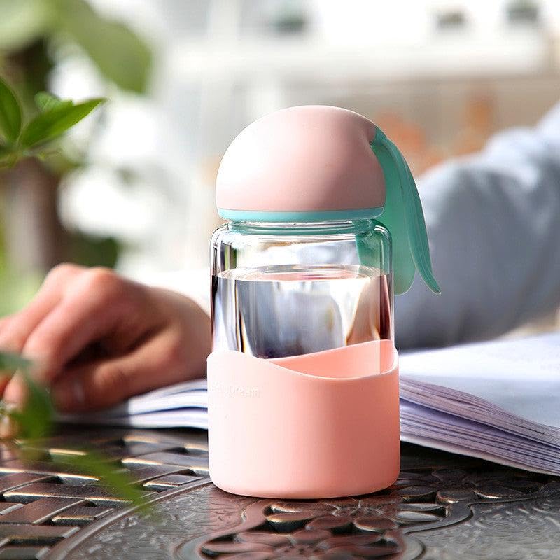 Generic - كوب زجاج شفاف مزود بمقبض على شكل أذن أرنب بقاعدة سيليكون قوية وغطاء ثابت آمن للأطفال وخالي من مادة بيسفينول أ مثالي للماء والعصير واللبن والسفر مع ألوان زاهية