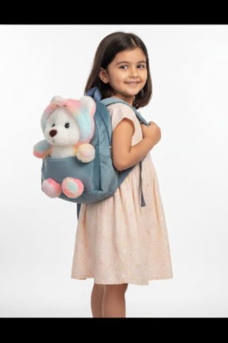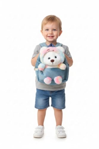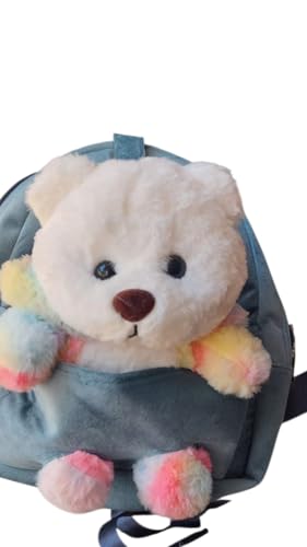 حقيبة ظهر أطفال بتصميم دب قوس قزح، حقيبة مدرسية بلاشية مع لعبة دب محشوة
