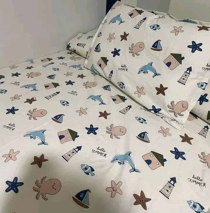 - تصميم مميز: نقشات بحرية جذابة تتضمن دلافين ونجوم البحر وقوارب صغيرة بألوان زرقاء وبنية