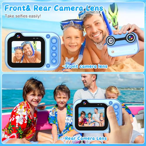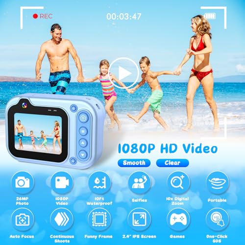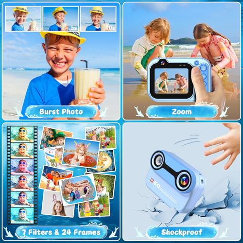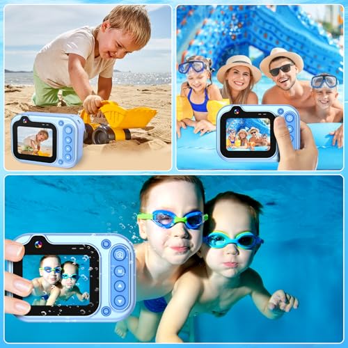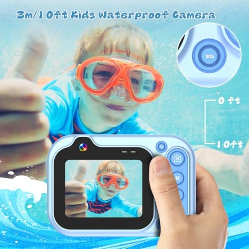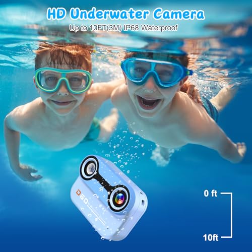 Nawchedo - كاميرا أطفال مقاومة للماء وتعمل تحت الماء بعمق 3 م وبدقة 48 ميجابيكسل 1080P HD وتكبير رقمي 10X وشاشة IPS مقاس 2.4 بوصة مع بطاقة 32 جيجابايت، كاميرا اكشن رقمية للأطفال