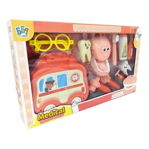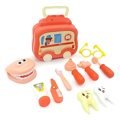 Generic - مجموعة طبيب الأسنان للأطفال، عيادة متنقلة 2 في 1، 10 قطع مع حقيبة سيارة إسعاف، 20 × 22 سم (وردي)
