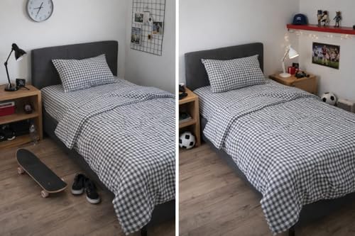 - محتويات المجموعة: تتضمن 2 غطاء لحاف بمقاس 180×240 سم و 2 كيس خدادية بنمط كارو رمادي أنيق ومناسب لغرف الأطفال