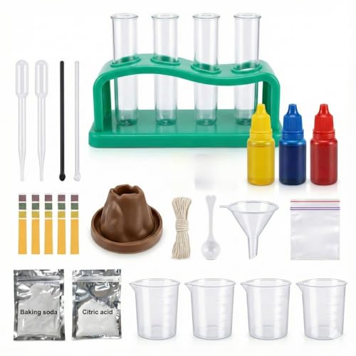 - طقم تعليمي متكامل: يحتوي على جميع الأدوات اللازمة بما في ذلك حامل أنابيب اختبار، أنابيب اختبار، كؤوس قياس، قطارات، ملاعق، قمع، ألوان سائلة، شرائط قياس، بيكربونات الصوديوم، حمض الستريك، قالب بركان، وحبل لإجراء التجارب بسهولة