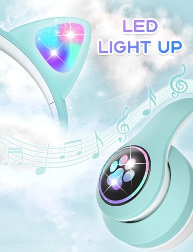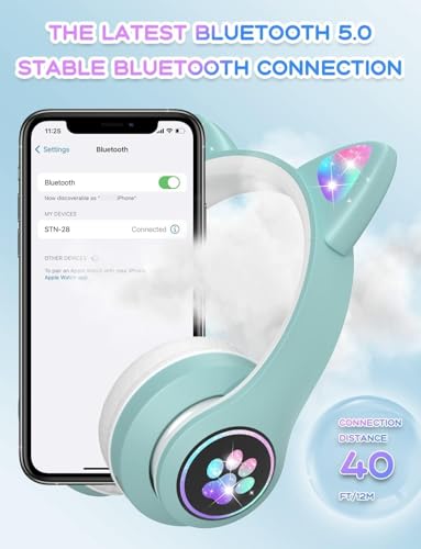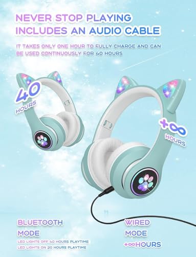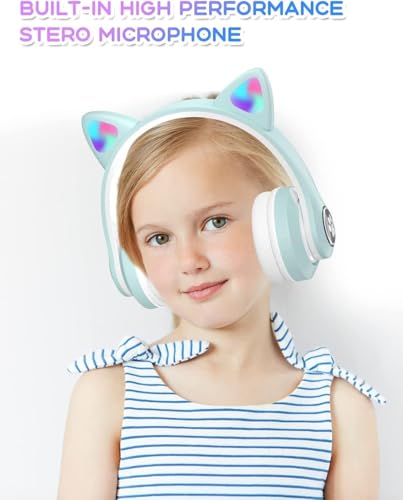 Generic - سماعات رأس بلوتوث مع ميكروفون وإضاءة ليد ار جي بي بتصميم مطوي بنمط أذن قطة مع صوت قدره 94 ديسيبل وصوت ستيريو للأطفال، موديل STN-28 (لون أخضر فاتح)