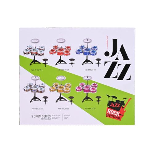 - طقم طبول جاز كامل: يتضمن 5 طبول بتصميم احترافي مع حامل سيمبال واحد وكرسي مريح، مثالي لتعليم الأطفال أساسيات العزف على الآلات الإيقاعية