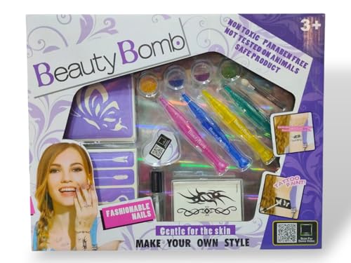 - محتويات المجموعة: تشمل أقلام مكياج ملونة، بريق للزينة، استنسل للوشم المؤقت، وأدوات تزيين الأظافر لتجربة تجميل شاملة