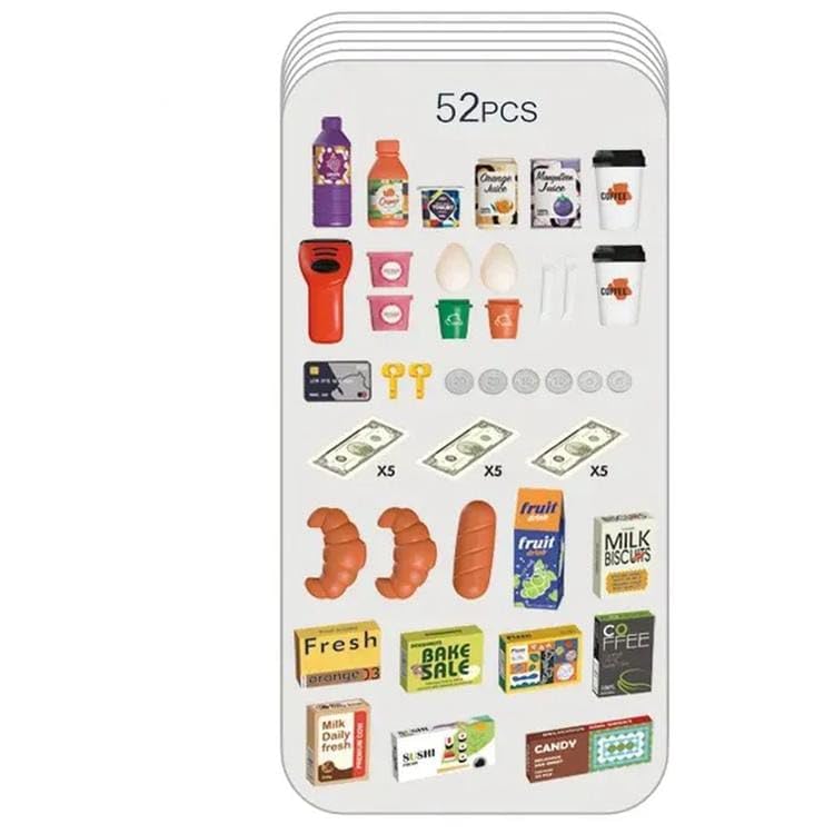 - الملحقات المتضمنة: تأتي مع مواد طعام للعب مثل الفواكه والبيض وسلة تسوق وأموال لعبة للعب الأدوار.