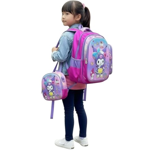 Generic - حقيبة مدرسية للأطفال مع حافظة طعام مبطنة حراري وحافظة أقلام، تصميم كرتوني، لون أرجواني وزهري