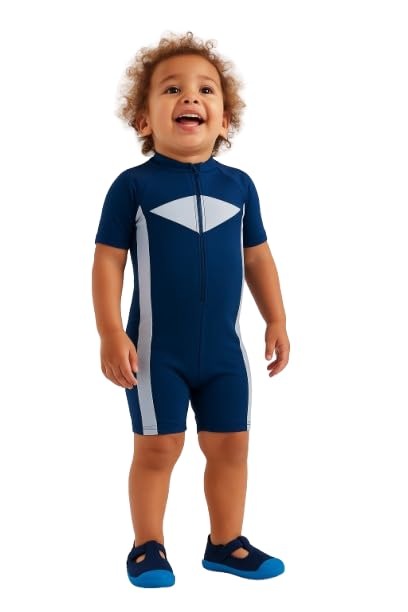 Generic - بدلة سباحة من قطعة واحدة باكمام قصيرة للاطفال من الجنسين، ازرق مع الواح بيضاء، تصميم سحاب امامي، بدلة تدريب للسباحة (سنة واحدة)