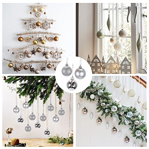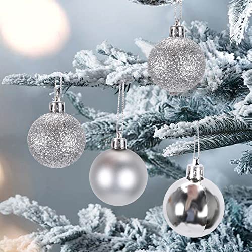 - 🎄【محتويات العبوة】ستحصل على 24 قطعة من كرات شجرة الكريسماس بقطر 4 سم. إنها تلمع في الضوء. المظهر الفضي أكثر ملاءمة للشتاء ويخلق جوًا حالمًا. إنها زينة مثالية للكريسماس.