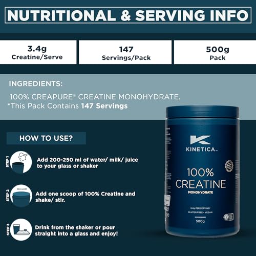 - المزايا: خالٍ من الجلوتين ونباتي. يتكون مسحوق الكرياتين من كينتيكا من مسحوق الكرياتين أحادي الهيدرات بنسبة 100%. يحتوي على 147 حصة بوزن 3.4 جرام