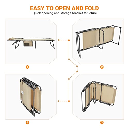 - مريح للغاية: كبير جدًا: 200 × 68 سم (الطول × العرض). يوفر لك سرير التخييم الواسع والممتد الكثير من حرية الحركة؛ سطح الاستلقاء المبطن المثبت بحبل تعليق مرن يوفر دعمًا أفضل ويجعلك لا تعاني من ألم أسفل الظهر؛ مع الوسادة القابلة للإزالة، يمكنك الاسترخاء جيدًا.