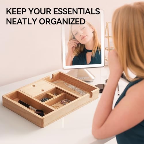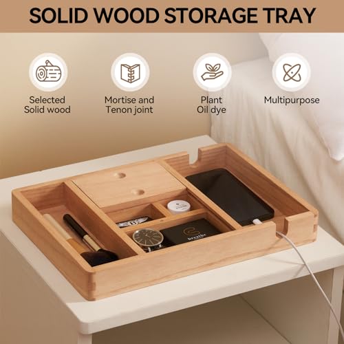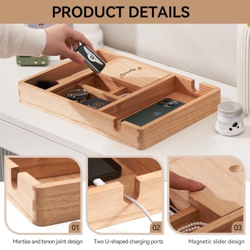 - 【مساحات عملية】: يوجد فتحتين على جانب الصينية لتسهيل وضع الأسلاك أثناء شحن الهاتف. مقسمة إلى 6 مساحات تخزين بأحجام مختلفة، مناسبة لأنواع مختلفة من الأشياء. يتميز الجزء الأوسط بتصميم غطاء منزلق، والذي يحمي الأشياء الثمينة بفعالية.