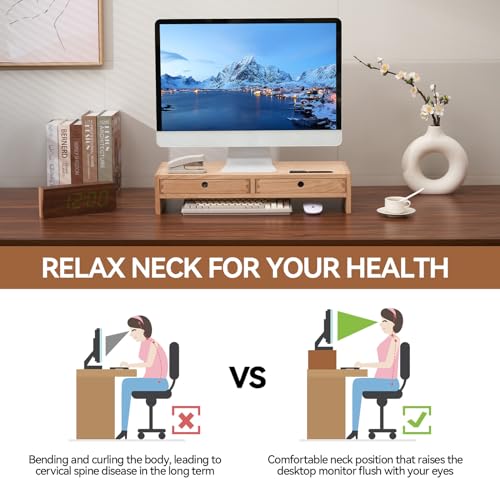 - تصميم مريح: حامل شاشة الكمبيوتر المريح (يبلغ ارتفاعه 4.92 انش) للحفاظ على شاشتك على ارتفاع مريح على مستوى العين، وتحسين الوضع بشكل فعال لتخفيف إجهاد العين ومنع آلام الظهر والرقبة طوال أيام العمل.