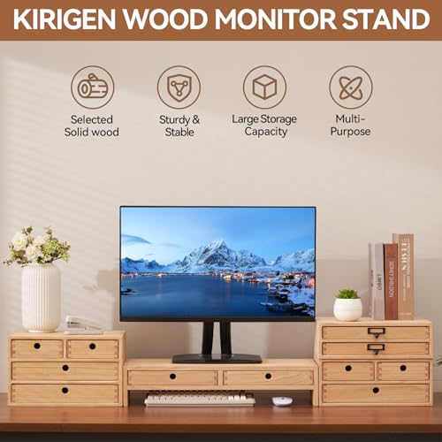 KIRIGEN - كيريجن حامل شاشة خشبي بدرجين - منظم تخزين مكتبي بذراع للكمبيوتر، حامل لمكبر الصوت والتلفزيون واللابتوب والطابعة مع فتحة للقلم وادارة الكابلات، رف مكتبي بطبقتين NA-2PMJ