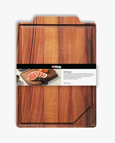 Kisag - لوح تقطيع ارتيزان من كيساج، مصنوع من خشب الجوز الأوروبي معتمد من مجلس رعاية الغابات، مقاس 36 × 26 سم، مع فتحة لتجميع السوائل ومقابض مجوفة، امن غذائيا ومعالج بالزيت الطبيعي