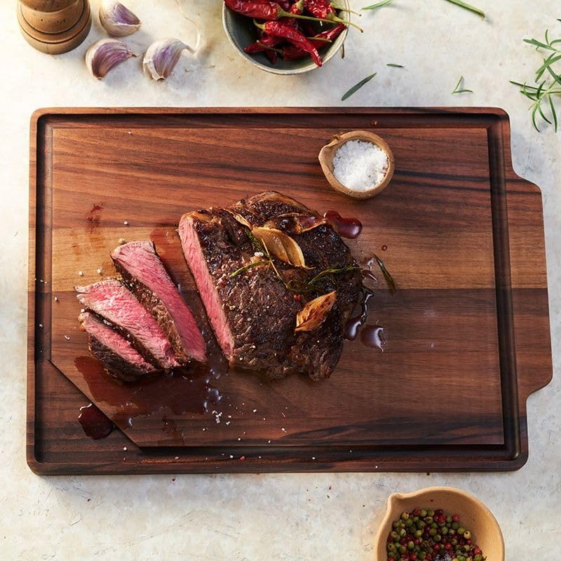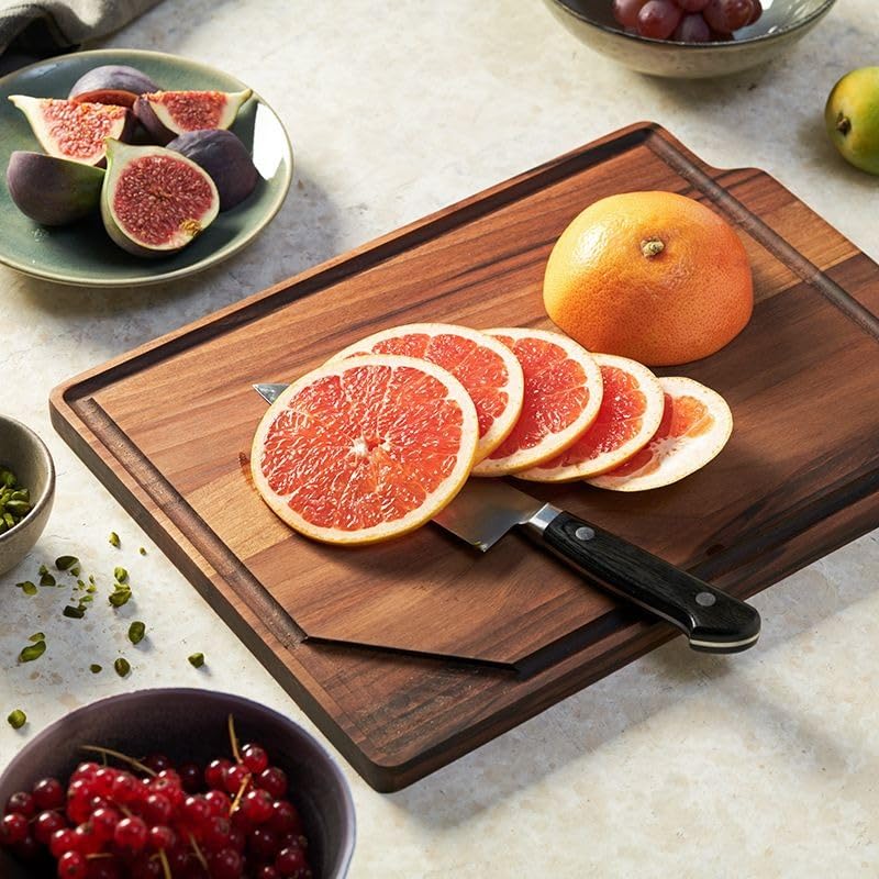 - خامة ممتازة: مصنوع من خشب الجوز الأوروبي المعتمد من مجلس رعاية الغابات، مما يوفر سطح تقطيع متين وصديق للسكين للاستخدام اليومي في المطبخ.