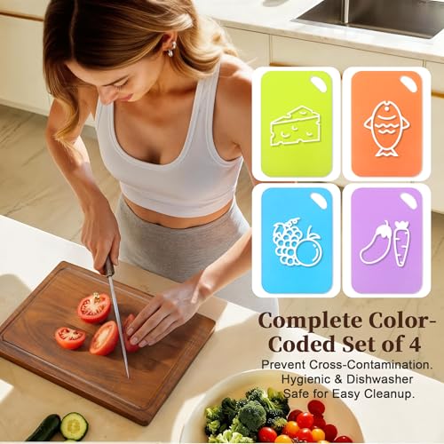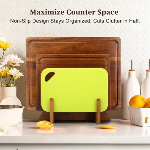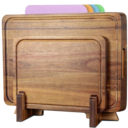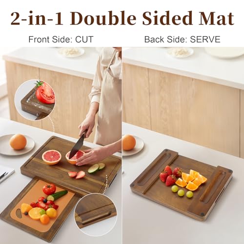 Kisfam - ألواح تقطيع من خشب الأكاسيا للمطبخ مع أخدود عصير ومقبض وأقدام غير قابلة للانزلاق وألواح بلاستيكية لوح تقطيع قابل للعكس للحوم والخضروات من كيسفام (بني)