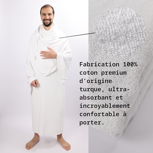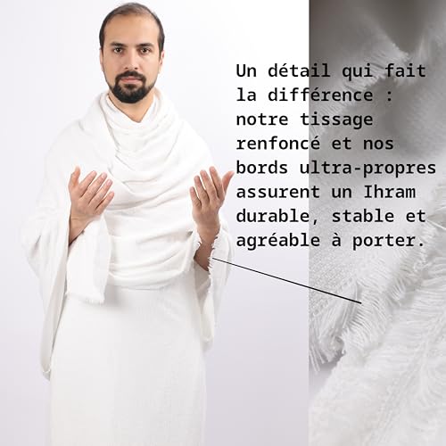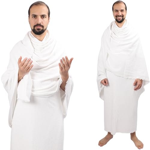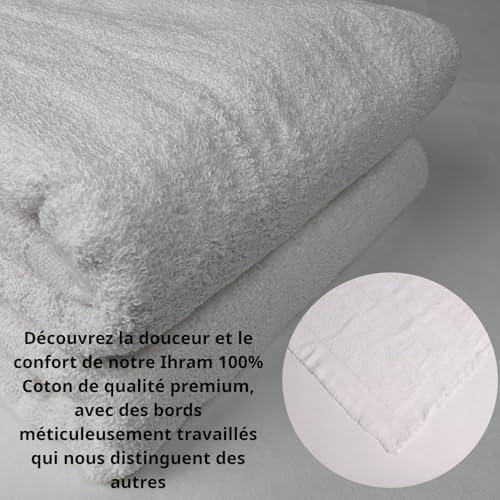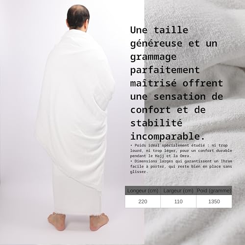 - مجموعة عملية: يتكون ثوب الإحرام هذا من منشفتين من القطن الأبيض الطبيعي، بطول 220 سم وعرض 110 سم. هذه الأبعاد مثالية للف الزي حول حزامك عدة مرات. يغطي إزار العورة بالكامل، مما يضمن بقاء المنطقة الواقعة بين السرة والركبتين مخفية. يزن هذا الإحرام 1350 غرام، ويتكيف بشكل مثالي مع الظروف الجوية في مكة. لا يمكن الرؤية من خلالها، فهي توفر راحة لا مثيل لها..