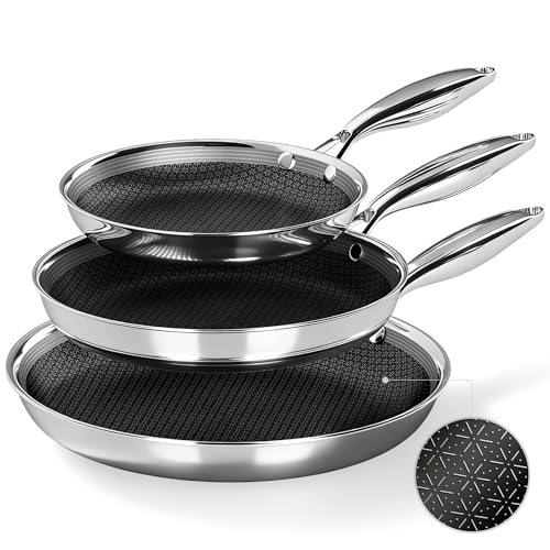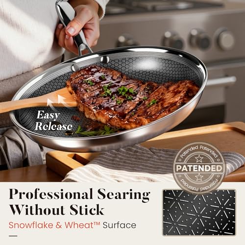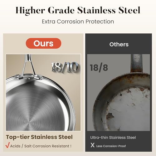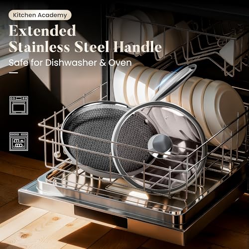KITCHEN ACADEMY BETTER LIVING THROUGH COOKING PERFECTION - مقلاة ستانلس ستيل ثلاثية الطبقات من كيتشن اكاديمي مقاس 8/10/12 انش، مجموعة اواني طهي غير سامة وخالية من حمض بيرفلورو الاوكتانويك ومقلاة احترافية، امنة للاستخدام في غسالة الصحون والفرن حتى 500 درجة